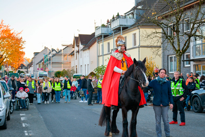 Anschließend begab man sich dann gemeinsam zur Hofackerstraße, wo der Zug sich (wie auch schon bei der ersten Ausgabe) formierte und schlussendlich auf den Weg machte. Angeführt von Sankt Martin hoch zu Ross, zogen viele bunte Laternen entlang der Lutherstraße, der Duisburger Straße und der Hansastraße.